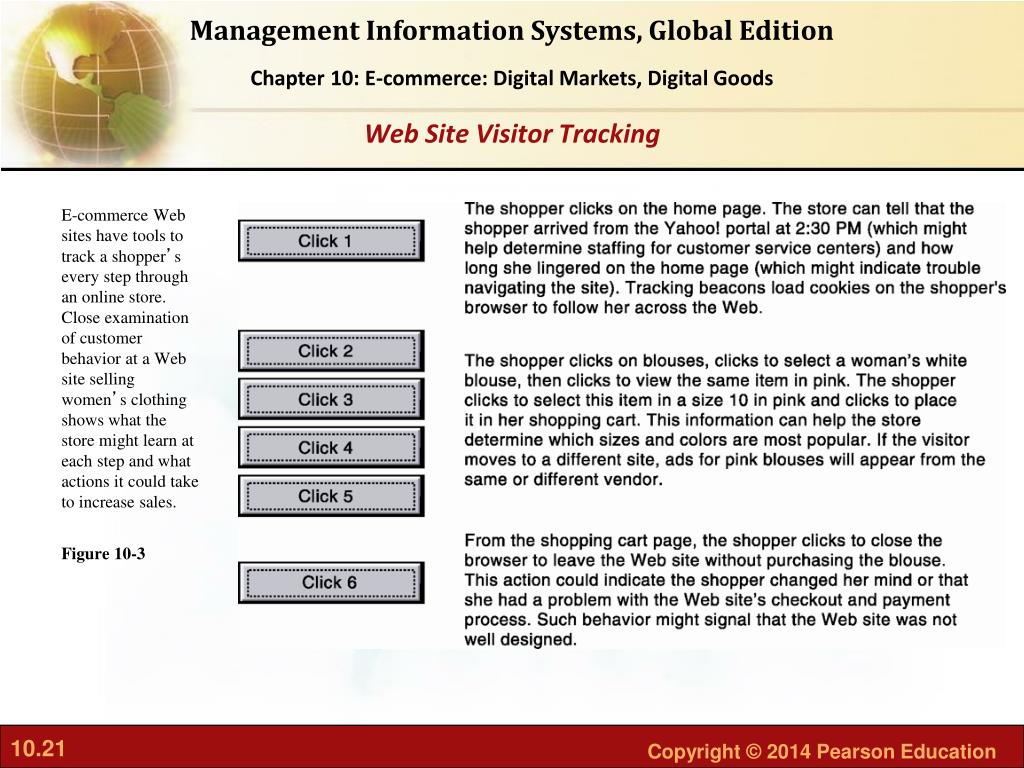 E-commerce Web sites have tools to track a shopper’s every step through an online store. Close examination of customer behavior at a Web site selling women’s clothing shows what the store might learn at each step and what actions it could take to increase sales. Figure 10-3 Web Site Visitor Tracking