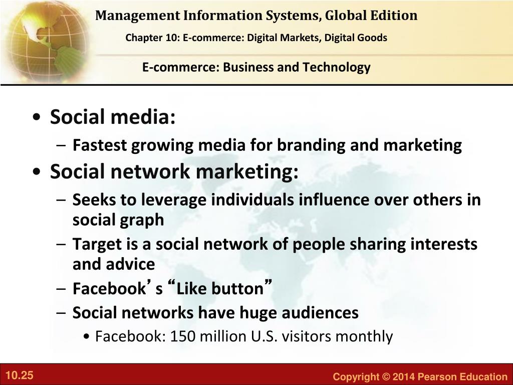 E-commerce: Business and Technology • Social media: • Fastest growing media for branding and marketing • Social network marketing: • Seeks to leverage individuals influence over others in social graph • Target is a social network of people sharing interests and advice • Facebook’s “Like button” • Social networks have huge audiences • Facebook: 150 million U.S. visitors monthly