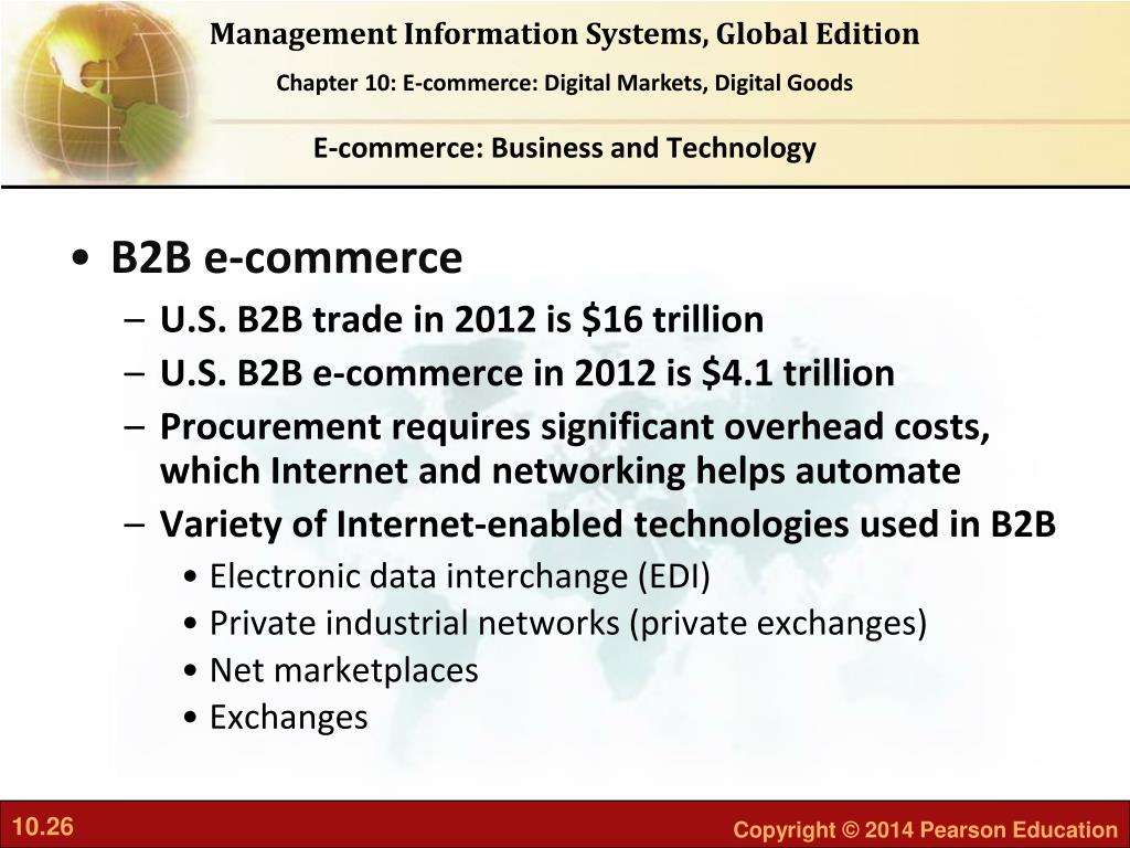 E-commerce: Business and Technology • B2B e-commerce • U.S. B2B trade in 2012 is $16 trillion • U.S. B2B e-commerce in 2012 is $4.1 trillion • Procurement requires significant overhead costs, which Internet and networking helps automate • Variety of Internet-enabled technologies used in B2B • Electronic data interchange (EDI) • Private industrial networks (private exchanges) • Net marketplaces • Exchanges
