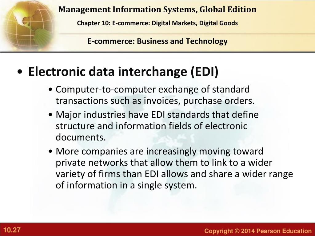 E-commerce: Business and Technology • Electronic data interchange (EDI) • Computer-to-computer exchange of standard transactions such as invoices, purchase orders. • Major industries have EDI standards that define structure and information fields of electronic documents. • More companies are increasingly moving toward private networks that allow them to link to a wider variety of firms than EDI allows and share a wider range of information in a single system.