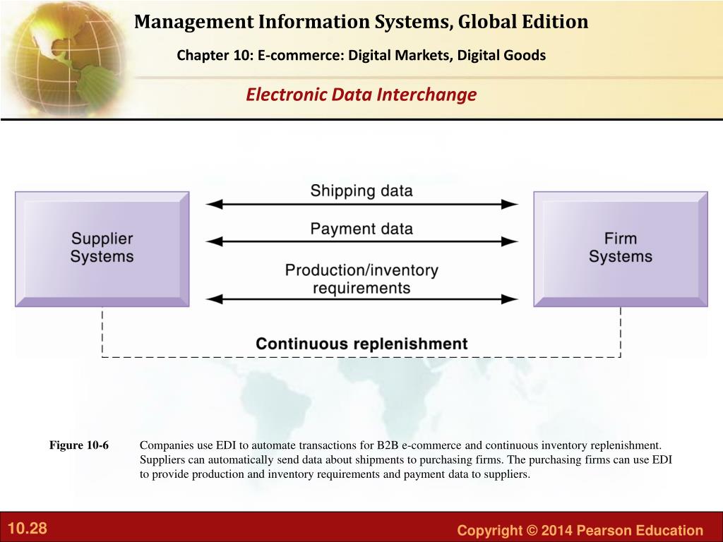 Companies use EDI to automate transactions for B2B e-commerce and continuous inventory replenishment. Suppliers can automatically send data about shipments to purchasing firms. The purchasing firms can use EDI to provide production and inventory requirements and payment data to suppliers. Figure 10-6 Electronic Data Interchange