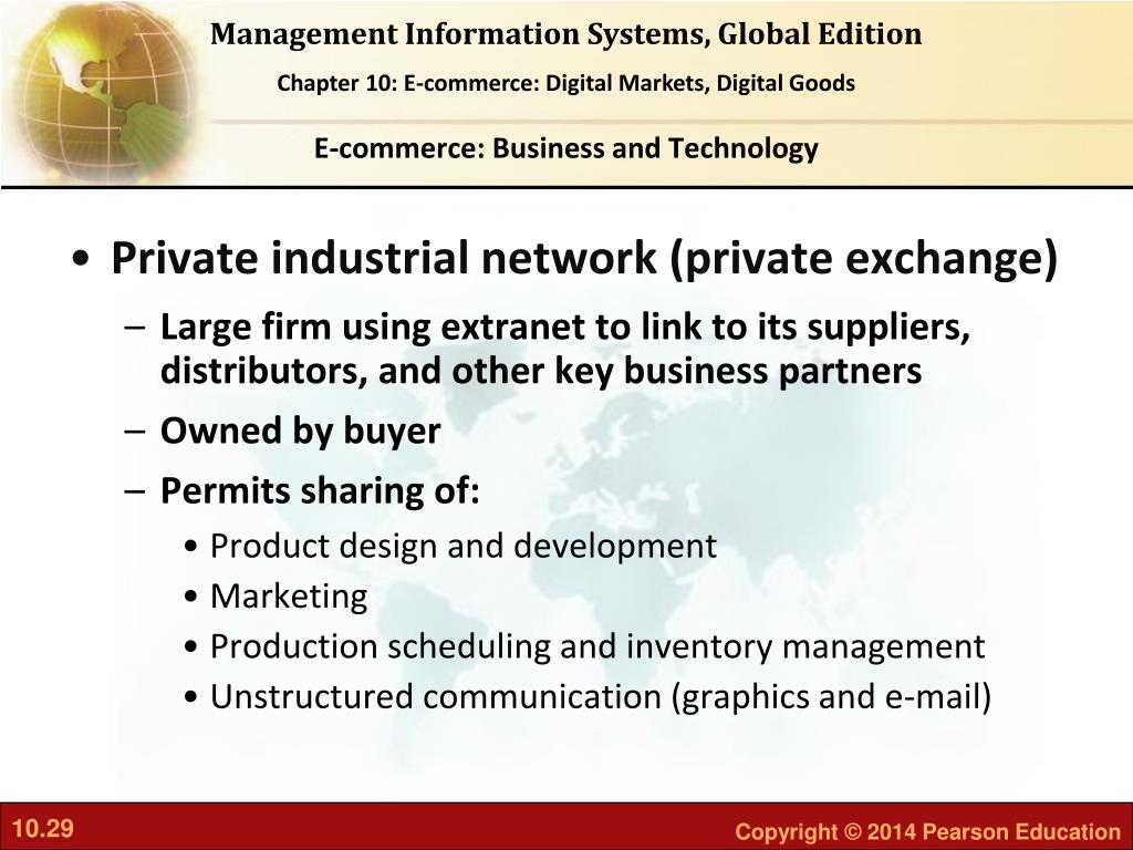 A private industrial network, also known as a private exchange, links a firm to its suppliers, distributors, and other key business partners for efficient supply chain management and other collaborative commerce activities. Figure 10-7 A Private Industrial Network
