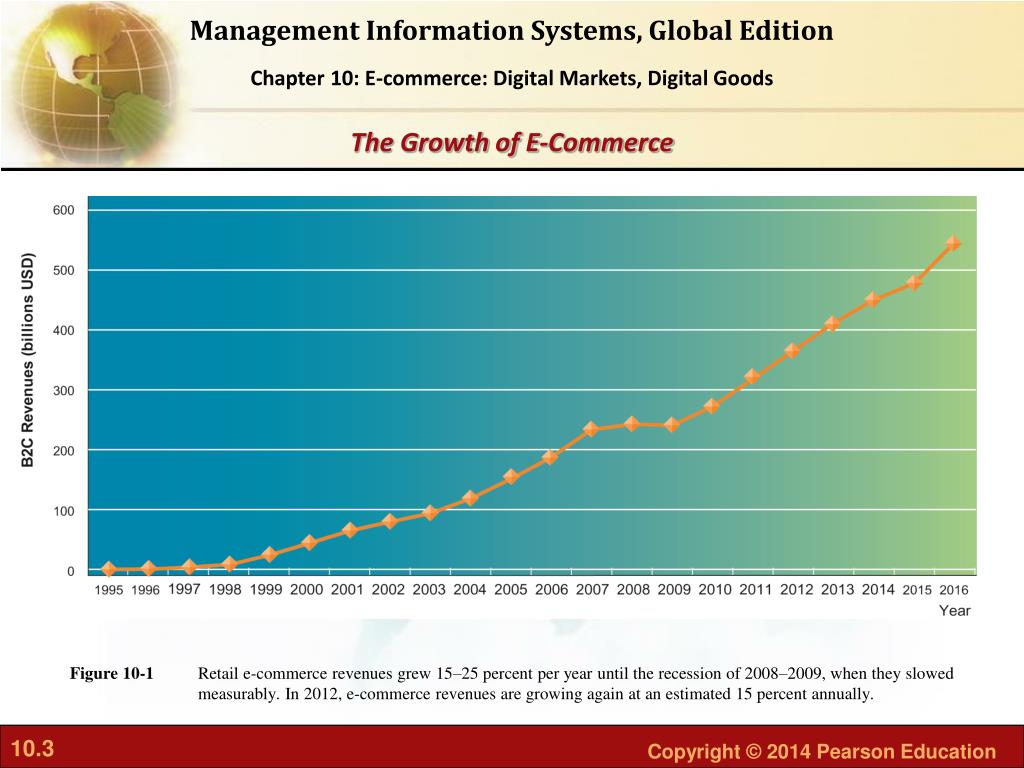 Retail e-commerce revenues grew 15–25 percent per year until the recession of 2008–2009, when they slowed measurably. In 2012, e-commerce revenues are growing again at an estimated 15 percent annually. Figure 10-1 The Growth of E-Commerce