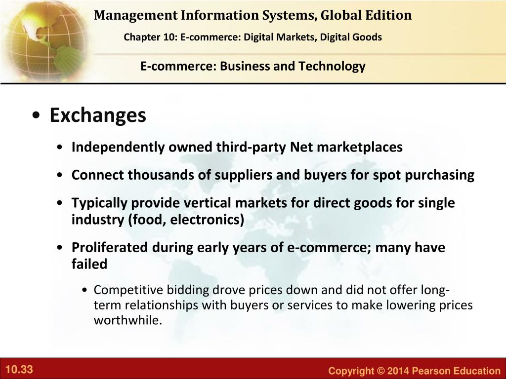 E-commerce: Business and Technology • Exchanges • Independently owned third-party Net marketplaces • Connect thousands of suppliers and buyers for spot purchasing • Typically provide vertical markets for direct goods for single industry (food, electronics) • Proliferated during early years of e-commerce; many have failed • Competitive bidding drove prices down and did not offer long-term relationships with buyers or services to make lowering prices worthwhile.