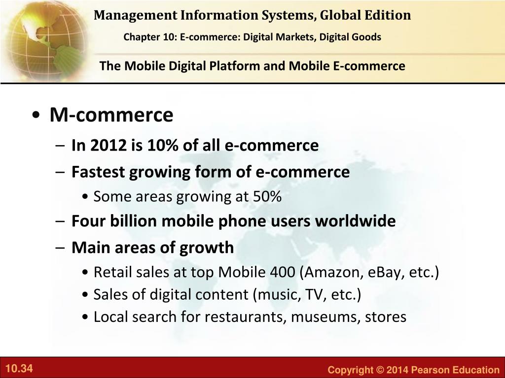 The Mobile Digital Platform and Mobile E-commerce • M-commerce • In 2012 is 10% of all e-commerce • Fastest growing form of e-commerce • Some areas growing at 50% • Four billion mobile phone users worldwide • Main areas of growth • Retail sales at top Mobile 400 (Amazon, eBay, etc.) • Sales of digital content (music, TV, etc.) • Local search for restaurants, museums, stores