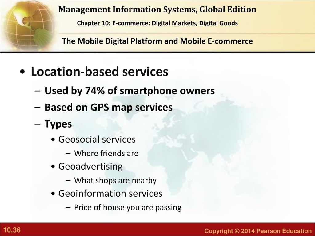 The Mobile Digital Platform and Mobile E-commerce • Location-based services • Used by 74% of smartphone owners • Based on GPS map services • Types • Geosocial services • Where friends are • Geoadvertising • What shops are nearby • Geoinformation services • Price of house you are passing