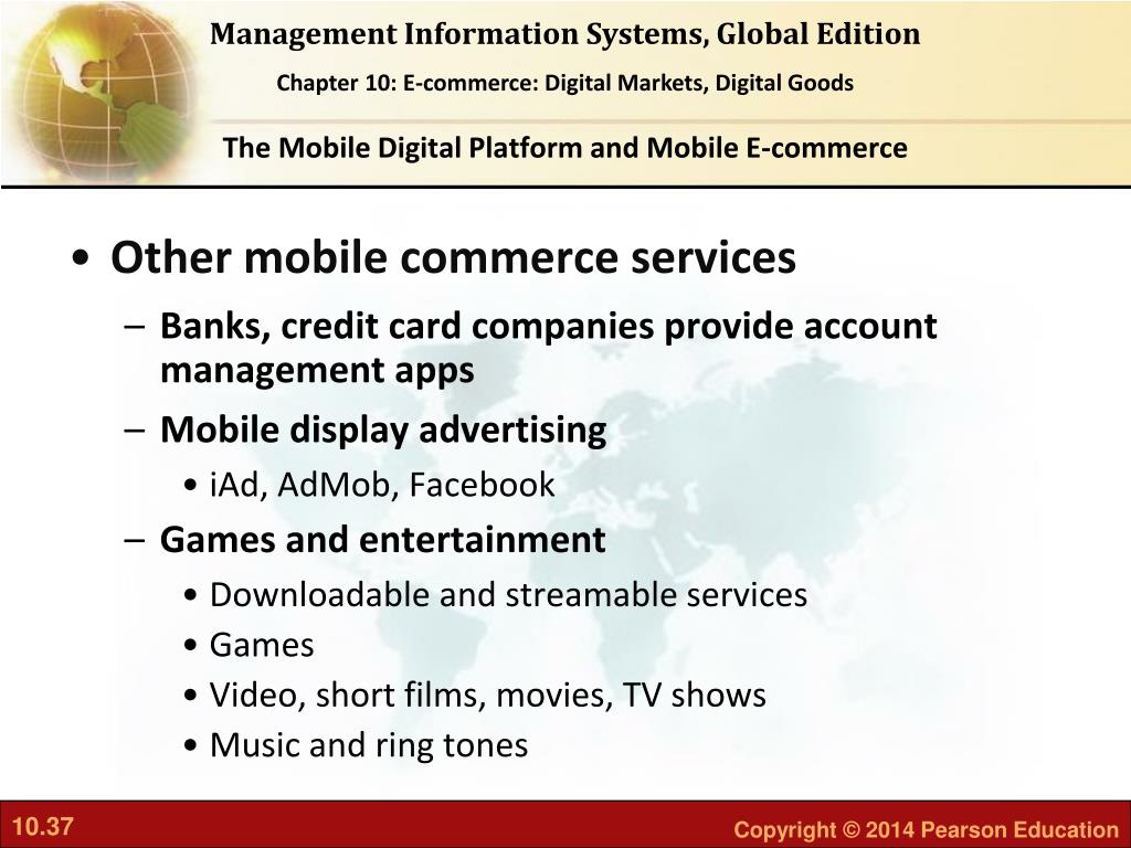 The Mobile Digital Platform and Mobile E-commerce • Other mobile commerce services • Banks, credit card companies provide account management apps • Mobile display advertising • iAd, AdMob, Facebook • Games and entertainment • Downloadable and streamable services • Games • Video, short films, movies, TV shows • Music and ring tones