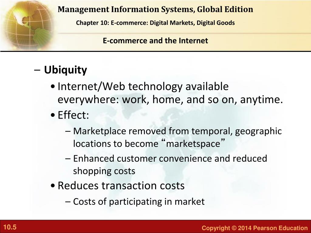 E-commerce and the Internet • Ubiquity • Internet/Web technology available everywhere: work, home, and so on, anytime. • Effect: • Marketplace removed from temporal, geographic locations to become “marketspace” • Enhanced customer convenience and reduced shopping costs • Reduces transaction costs • Costs of participating in market