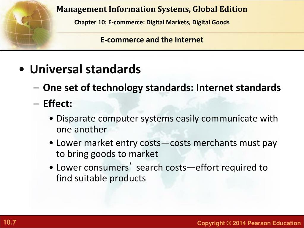 E-commerce and the Internet • Universal standards • One set of technology standards: Internet standards • Effect: • Disparate computer systems easily communicate with one another • Lower market entry costs—costs merchants must pay to bring goods to market • Lower consumers’ search costs—effort required to find suitable products