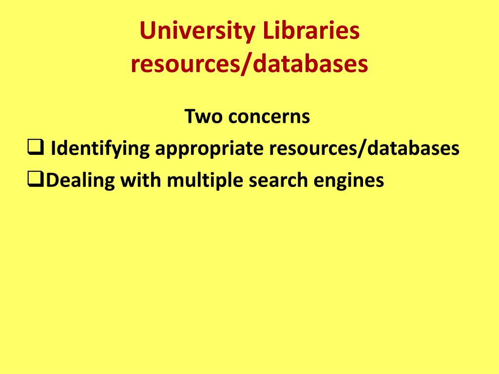 University Libraries resources/databases Two concerns • Identifying appropriate resources/databases • Dealing with multiple search engines