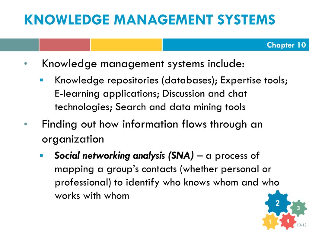 KNOWLEDGE MANAGEMENT SYSTEMS • Knowledge management systems include: • Knowledge repositories (databases); Expertise tools; E-learning applications; Discussion and chat technologies; Search and data mining tools • Finding out how information flows through an organization • Social networking analysis (SNA) – a process of mapping a group’s contacts (whether personal or professional) to identify who knows whom and who works with whom
