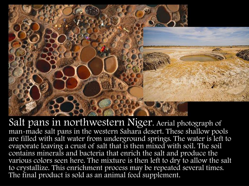Salt pans in northwestern Niger. Aerial photograph of man-made salt pans in the western Sahara desert. These shallow pools are filled with salt water from underground springs. The water is left to evaporate leaving a crust of salt that is then mixed with soil. The soil contains minerals and bacteria that enrich the salt and produce the various colors seen here. The mixture is then left to dry to allow the salt to crystallize. This enrichment process may be repeated several times. The final product is sold as an animal feed supplement.