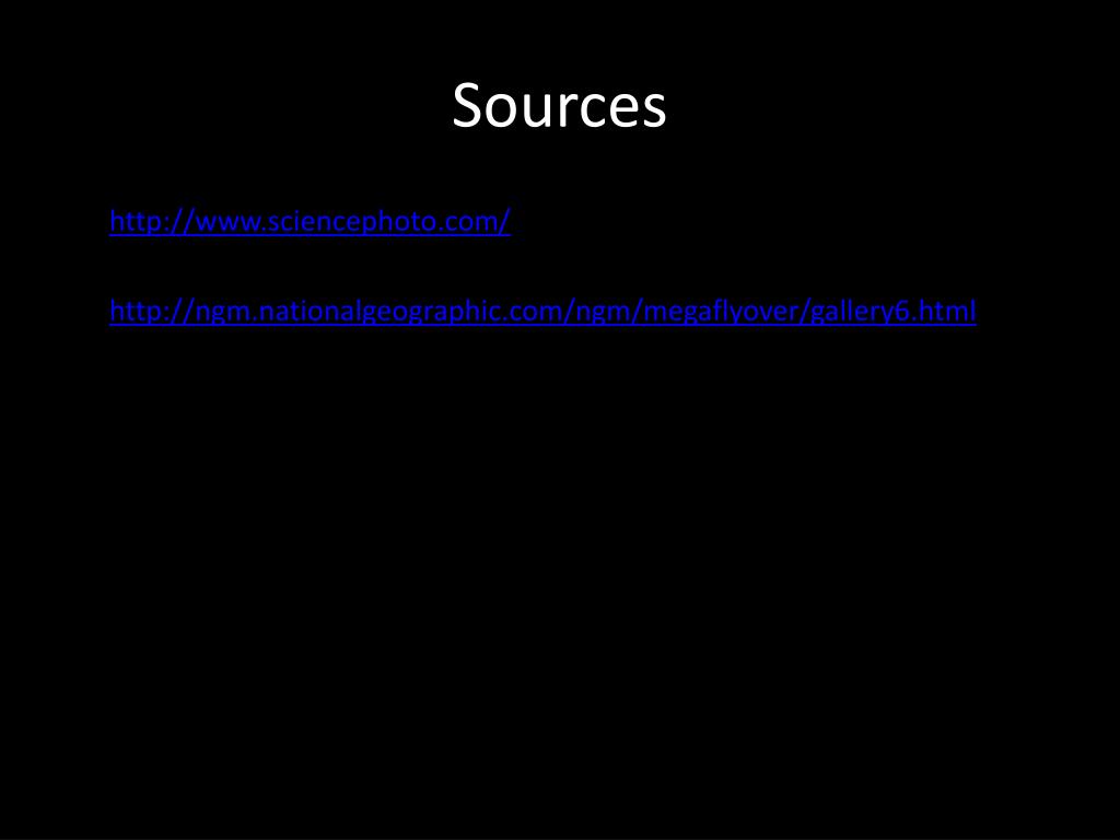 Sources • http://www.sciencephoto.com/ • http://ngm.nationalgeographic.com/ngm/megaflyover/gallery6.html