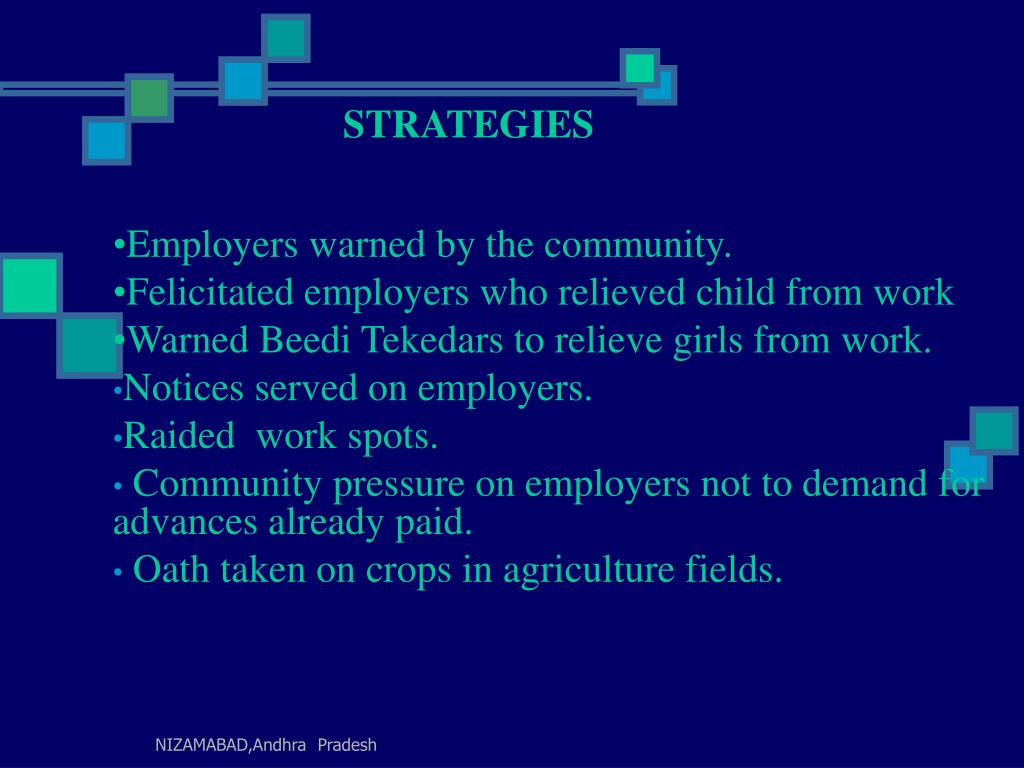 STRATEGIES • Employers warned by the community. • Felicitated employers who relieved child from work • Warned Beedi Tekedars to relieve girls from work. • Notices served on employers. • Raided work spots. • Community pressure on employers not to demand for advances already paid. • Oath taken on crops in agriculture fields. NIZAMABAD,Andhra Pradesh