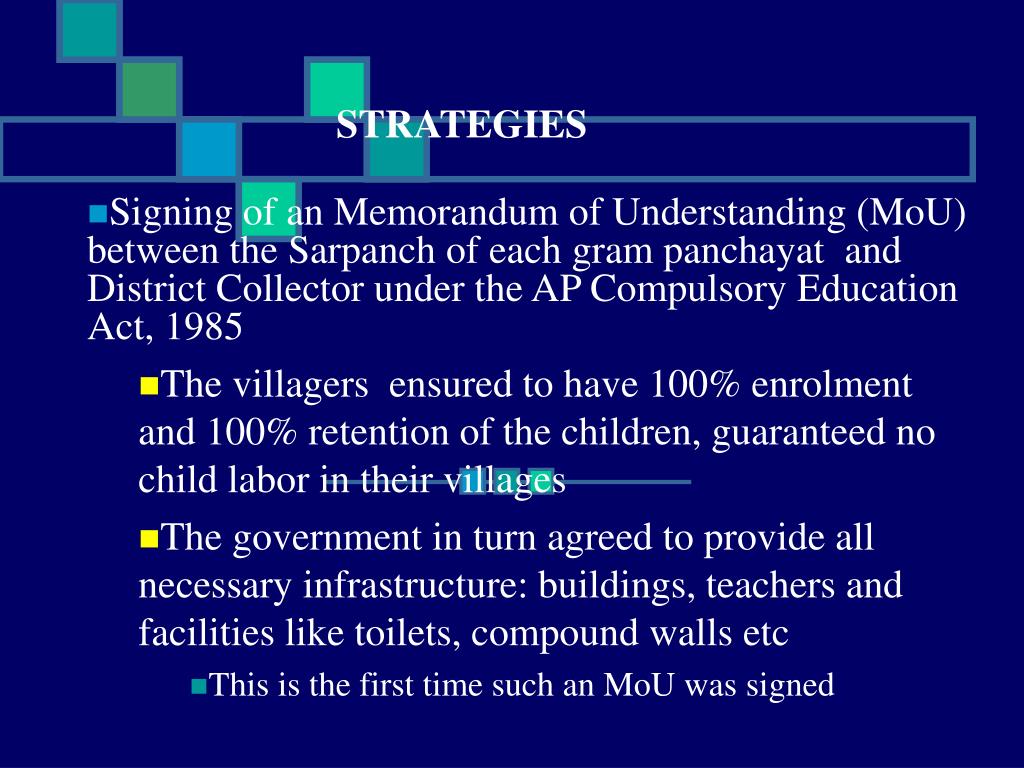 STRATEGIES Signing of an Memorandum of Understanding (MoU) between the Sarpanch of each gram panchayat and District Collector under the AP Compulsory Education Act, 1985 The villagers ensured to have 100% enrolment and 100% retention of the children, guaranteed no child labor in their villages The government in turn agreed to provide all necessary infrastructure: buildings, teachers and facilities like toilets, compound walls etc This is the first time such an MoU was signed
