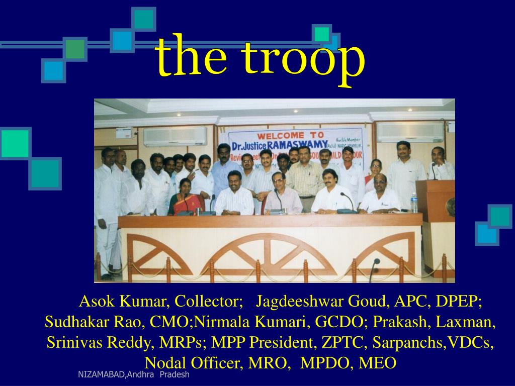 the troop Asok Kumar, Collector; Jagdeeshwar Goud, APC, DPEP; Sudhakar Rao, CMO;Nirmala Kumari, GCDO; Prakash, Laxman, Srinivas Reddy, MRPs; MPP President, ZPTC, Sarpanchs,VDCs, Nodal Officer, MRO, MPDO, MEO NIZAMABAD,Andhra Pradesh