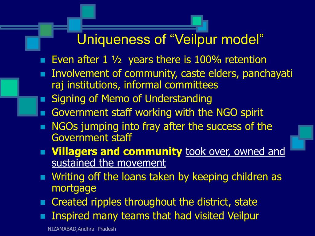 Uniqueness of “Veilpur model” • Even after 1 ½ years there is 100% retention • Involvement of community, caste elders, panchayati raj institutions, informal committees • Signing of Memo of Understanding • Government staff working with the NGO spirit • NGOs jumping into fray after the success of the Government staff • Villagers and communitytook over, owned and sustained the movement • Writing off the loans taken by keeping children as mortgage • Created ripples throughout the district, state • Inspired many teams that had visited Veilpur The saga continues……… NIZAMABAD,Andhra Pradesh