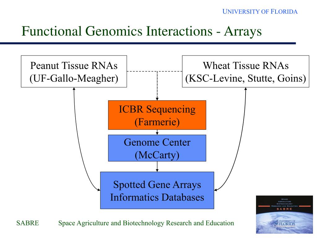 Functional Genomics Interactions - Arrays Peanut Tissue RNAs (UF-Gallo-Meagher) Wheat Tissue RNAs (KSC-Levine, Stutte, Goins) ICBR Sequencing (Farmerie) Genome Center (McCarty) Spotted Gene Arrays Informatics Databases
