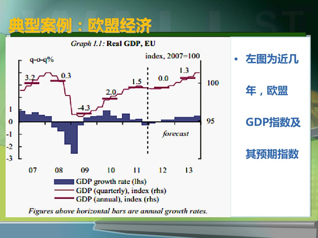 典型案例:欧盟经济 • 左图为近几年,欧盟GDP指数及其预期指数