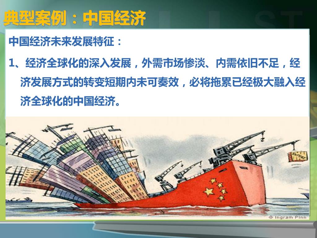 典型案例:中国经济 中国经济未来发展特征: 1、经济全球化的深入发展,外需市场惨淡、内需依旧不足,经济发展方式的转变短期内未可奏效,必将拖累已经极大融入经济全球化的中国经济。