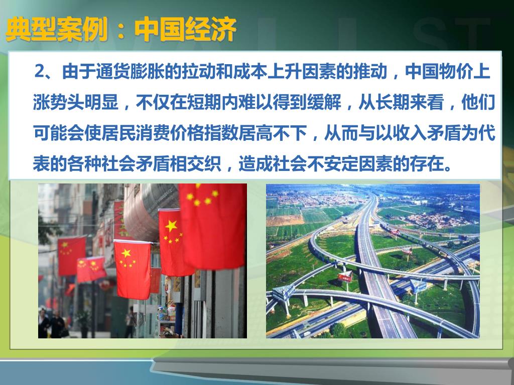 典型案例:中国经济 2、由于通货膨胀的拉动和成本上升因素的推动,中国物价上涨势头明显,不仅在短期内难以得到缓解,从长期来看,他们可能会使居民消费价格指数居高不下,从而与以收入矛盾为代表的各种社会矛盾相交织,造成社会不安定因素的存在。