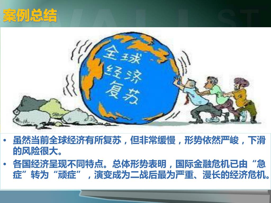 案例总结 • 虽然当前全球经济有所复苏,但非常缓慢,形势依然严峻,下滑的风险很大。 • 各国经济呈现不同特点。总体形势表明,国际金融危机已由“急症”转为“顽症”,演变成为二战后最为严重、漫长的经济危机。