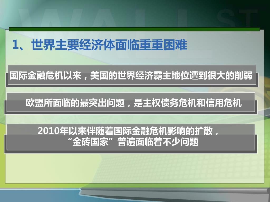2010年以来伴随着国际金融危机影响的扩散, “金砖国家”普遍面临着不少问题 国际金融危机以来,美国的世界经济霸主地位遭到很大的削弱 欧盟所面临的最突出问题,是主权债务危机和信用危机 1、世界主要经济体面临重重困难