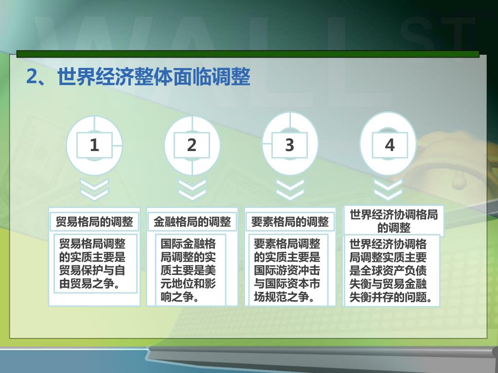 世界经济协调格局的调整 贸易格局的调整 要素格局的调整 金融格局的调整 2 1 3 4 贸易格局调整的实质主要是贸易保护与自由贸易之争。 要素格局调整的实质主要是国际游资冲击与国际资本市场规范之争。 国际金融格局调整的实质主要是美元地位和影响之争。 世界经济协调格局调整实质主要是全球资产负债失衡与贸易金融失衡并存的问题。 2、世界经济整体面临调整