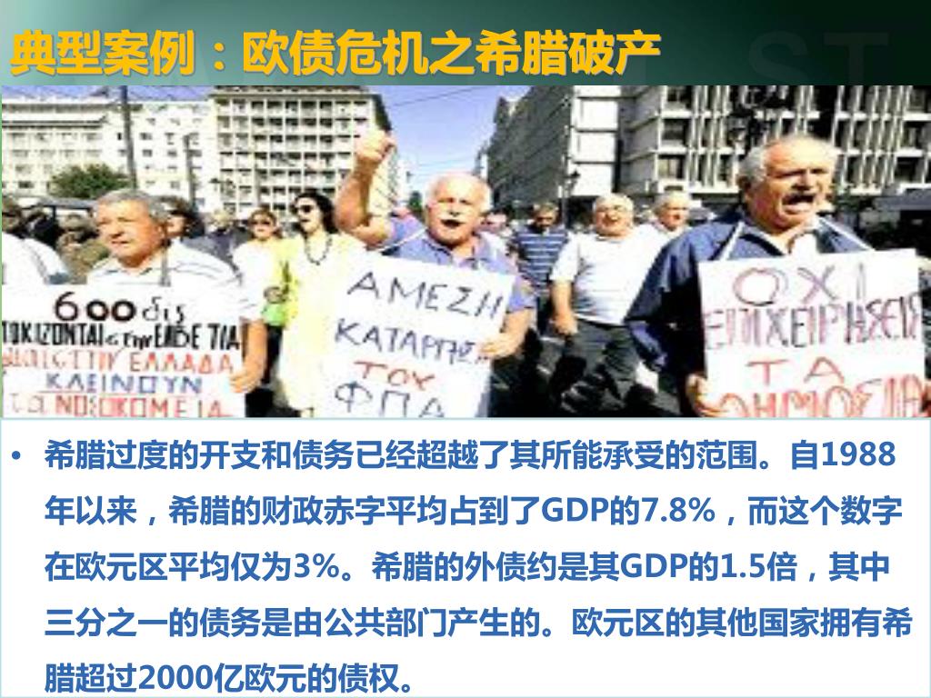 典型案例:欧债危机之希腊破产 • 希腊过度的开支和债务已经超越了其所能承受的范围。自1988年以来,希腊的财政赤字平均占到了GDP的7.8%,而这个数字在欧元区平均仅为3%。希腊的外债约是其GDP的1.5倍,其中三分之一的债务是由公共部门产生的。欧元区的其他国家拥有希腊超过2000亿欧元的债权。