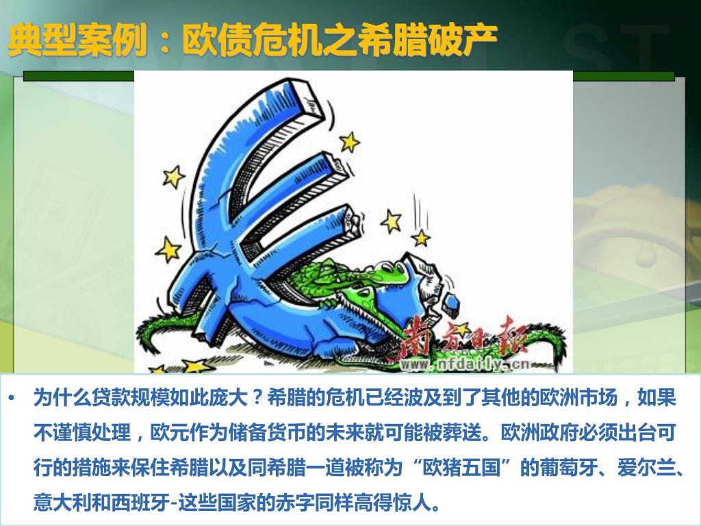 典型案例:欧债危机之希腊破产 • 为什么贷款规模如此庞大?希腊的危机已经波及到了其他的欧洲市场,如果不谨慎处理,欧元作为储备货币的未来就可能被葬送。欧洲政府必须出台可行的措施来保住希腊以及同希腊一道被称为“欧猪五国”的葡萄牙、爱尔兰、意大利和西班牙-这些国家的赤字同样高得惊人。