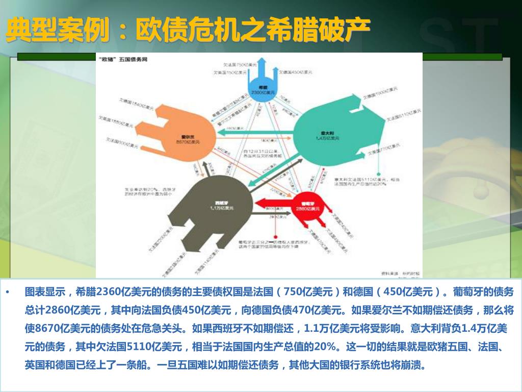 典型案例:欧债危机之希腊破产 • 图表显示,希腊2360亿美元的债务的主要债权国是法国(750亿美元)和德国(450亿美元)。葡萄牙的债务总计2860亿美元,其中向法国负债450亿美元,向德国负债470亿美元。如果爱尔兰不如期偿还债务,那么将使8670亿美元的债务处在危急关头。如果西班牙不如期偿还,1.1万亿美元将受影响。意大利背负1.4万亿美元的债务,其中欠法国5110亿美元,相当于法国国内生产总值的20%。这一切的结果就是欧猪五国、法国、英国和德国已经上了一条船。一旦五国难以如期偿还债务,其他大国的银行系统也将崩溃。