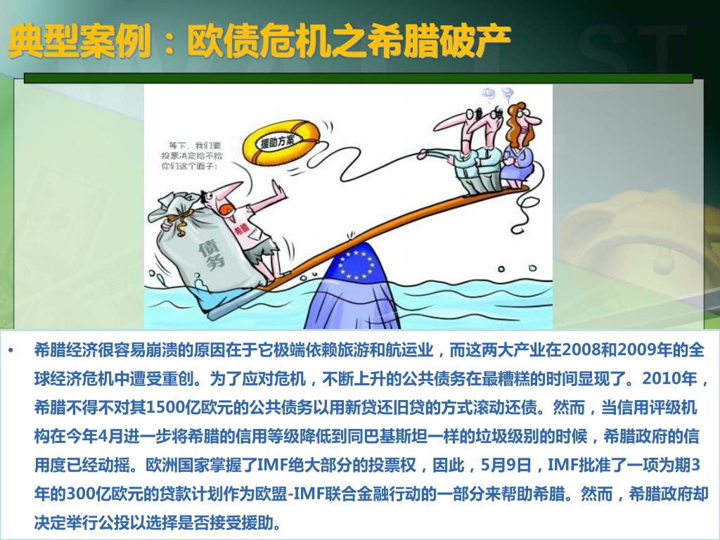 典型案例:欧债危机之希腊破产 • 希腊经济很容易崩溃的原因在于它极端依赖旅游和航运业,而这两大产业在2008和2009年的全球经济危机中遭受重创。为了应对危机,不断上升的公共债务在最糟糕的时间显现了。2010年,希腊不得不对其1500亿欧元的公共债务以用新贷还旧贷的方式滚动还债。然而,当信用评级机构在今年4月进一步将希腊的信用等级降低到同巴基斯坦一样的垃圾级别的时候,希腊政府的信用度已经动摇。欧洲国家掌握了IMF绝大部分的投票权,因此,5月9日,IMF批准了一项为期3年的300亿欧元的贷款计划作为欧盟-IMF联合金融行动的一部分来帮助希腊。然而,希腊政府却决定举行公投以选择是否接受援助。