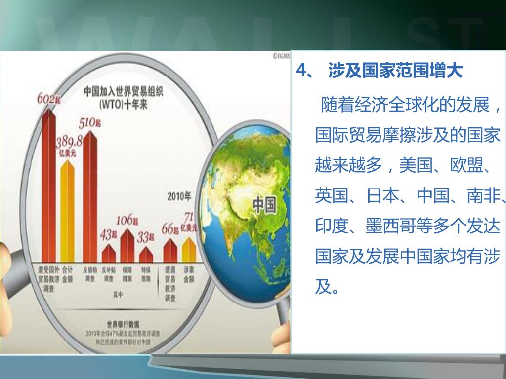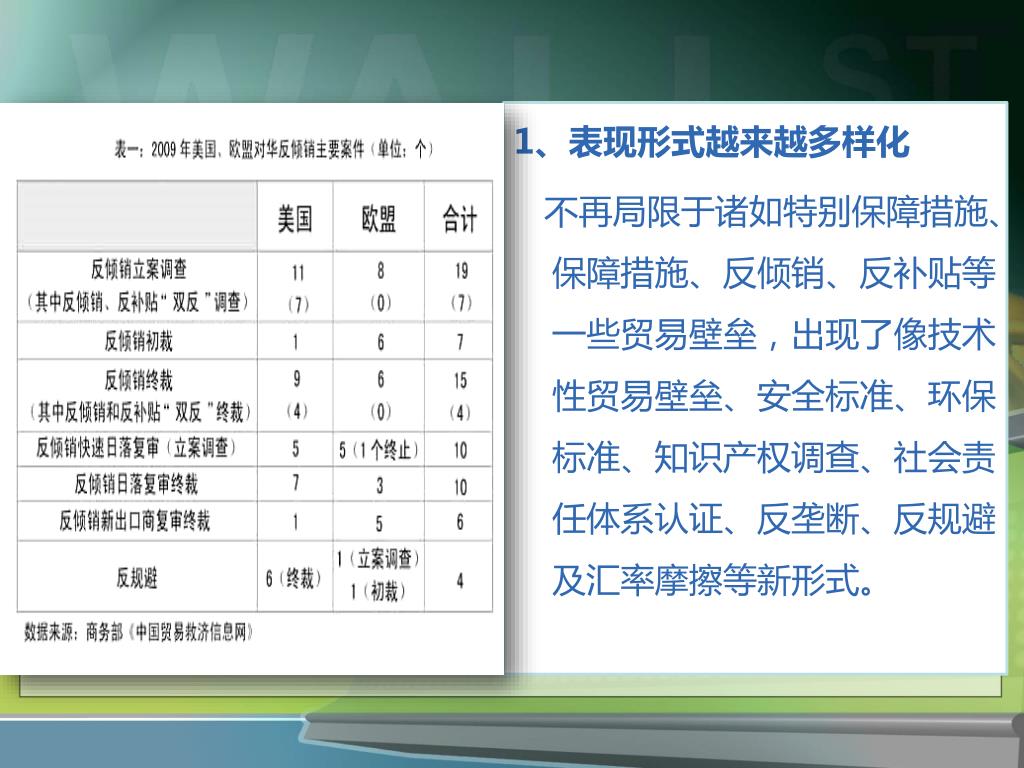 1、表现形式越来越多样化 不再局限于诸如特别保障措施、保障措施、反倾销、反补贴等一些贸易壁垒,出现了像技术性贸易壁垒、安全标准、环保标准、知识产权调查、社会责任体系认证、反垄断、反规避及汇率摩擦等新形式。