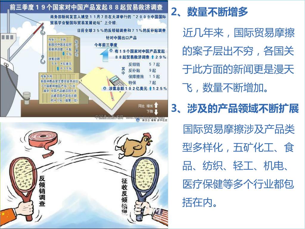 2、数量不断增多 近几年来,国际贸易摩擦的案子层出不穷,各国关于此方面的新闻更是漫天飞,数量不断增加。 3、涉及的产品领域不断扩展 国际贸易摩擦涉及产品类型多样化,五矿化工、食品、纺织、轻工、机电、医疗保健等多个行业都包括在内。