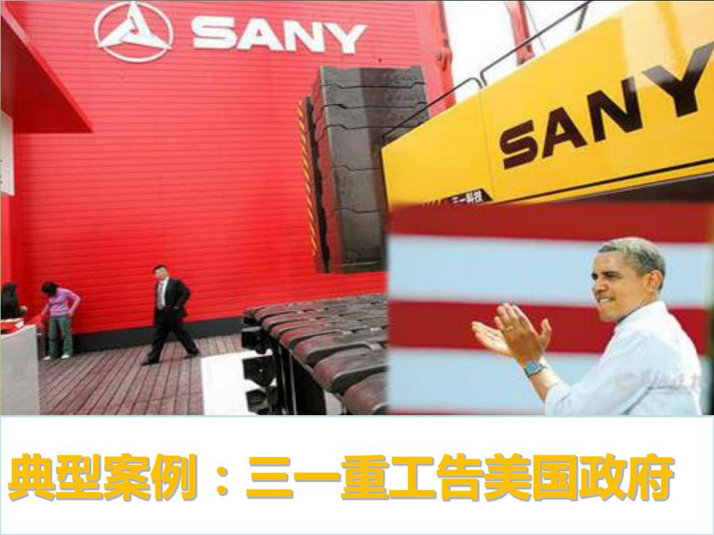 典型案例:三一重工告美国政府 • 三一重工不服,罗尔斯公司9月12日把“美国海外投资委员会”告上法庭,10月1日又向美国哥伦比亚特区联邦地方分区法院递交诉状,把奥巴马追加为被告,并向法院递交要求法院加快审理此案的动议。