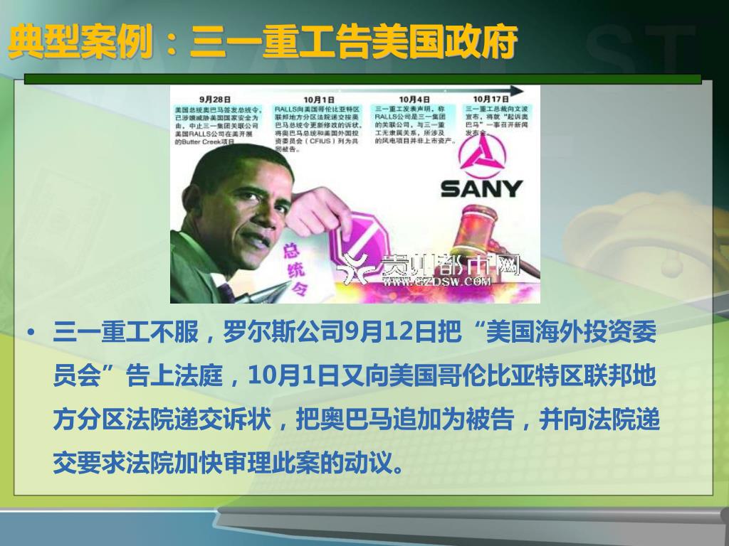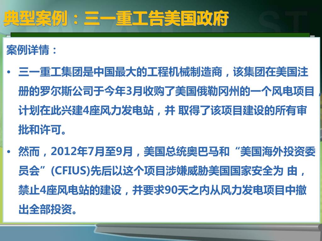 典型案例:三一重工告美国政府 案例详情: • 三一重工集团是中国最大的工程机械制造商,该集团在美国注册的罗尔斯公司于今年3月收购了美国俄勒冈州的一个风电项目,计划在此兴建4座风力发电站,并 取得了该项目建设的所有审批和许可。 • 然而,2012年7月至9月,美国总统奥巴马和“美国海外投资委员会”(CFIUS)先后以这个项目涉嫌威胁美国国家安全为由,禁止4座风电站的建设,并要求90天之内从风力发电项目中撤出全部投资。