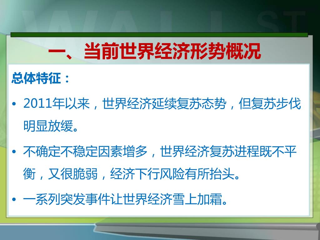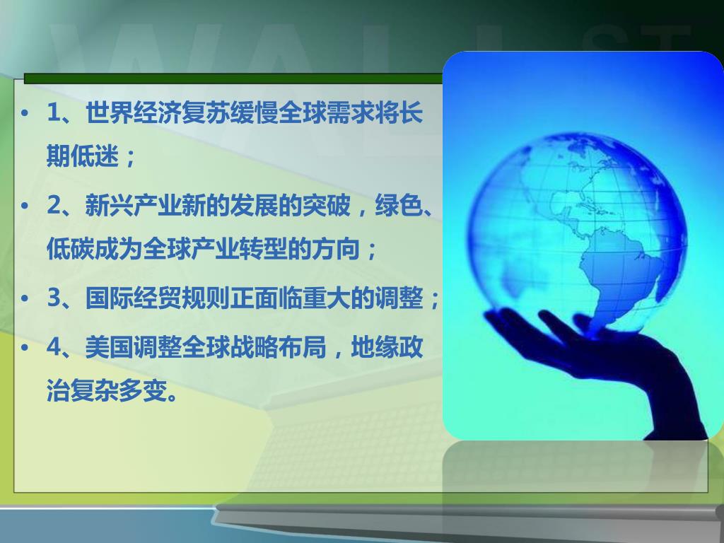 1、世界经济复苏缓慢全球需求将长期低迷; • 2、新兴产业新的发展的突破,绿色、低碳成为全球产业转型的方向; • 3、国际经贸规则正面临重大的调整; • 4、美国调整全球战略布局,地缘政治复杂多变。