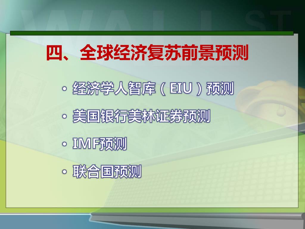 经济学人智库(EIU)预测 • 美国银行美林证券预测 • IMF预测 • 联合国预测 四、全球经济复苏前景预测