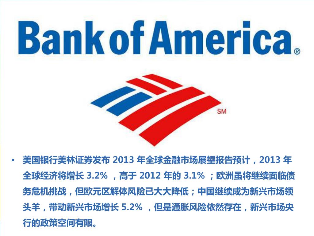美国银行美林证券发布 2013 年全球金融市场展望报告预计,2013 年全球经济将增长 3.2% ,高于 2012 年的 3.1% ;欧洲虽将继续面临债务危机挑战,但欧元区解体风险已大大降低;中国继续成为新兴市场领头羊,带动新兴市场增长 5.2% ,但是通胀风险依然存在,新兴市场央行的政策空间有限。