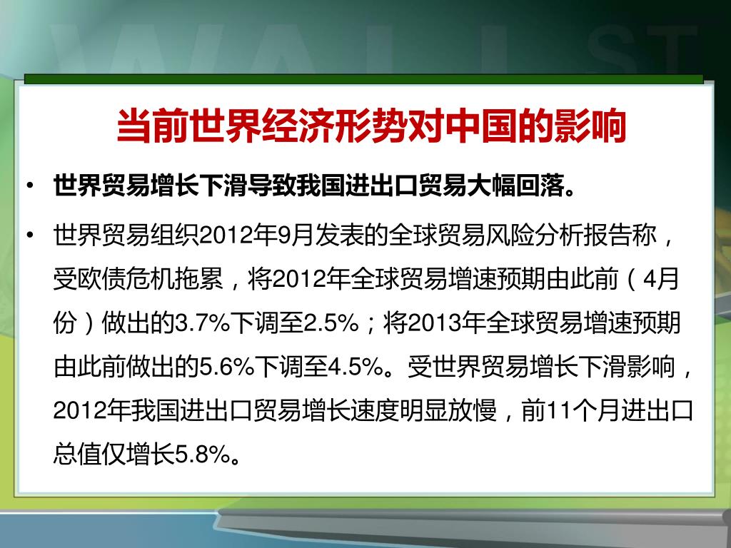 当前世界经济形势对中国的影响 • 世界贸易增长下滑导致我国进出口贸易大幅回落。 • 世界贸易组织2012年9月发表的全球贸易风险分析报告称,受欧债危机拖累,将2012年全球贸易增速预期由此前(4月份)做出的3.7%下调至2.5%;将2013年全球贸易增速预期由此前做出的5.6%下调至4.5%。受世界贸易增长下滑影响,2012年我国进出口贸易增长速度明显放慢,前11个月进出口总值仅增长5.8%。