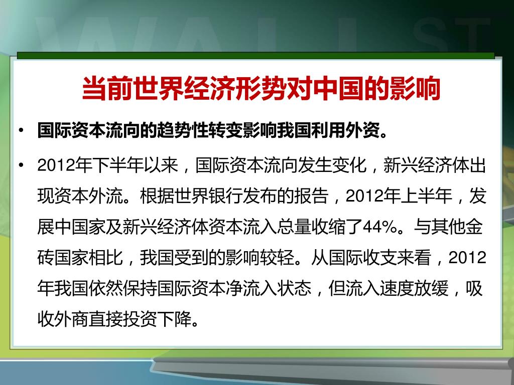 当前世界经济形势对中国的影响 • 国际资本流向的趋势性转变影响我国利用外资。 • 2012年下半年以来,国际资本流向发生变化,新兴经济体出现资本外流。根据世界银行发布的报告,2012年上半年,发展中国家及新兴经济体资本流入总量收缩了44%。与其他金砖国家相比,我国受到的影响较轻。从国际收支来看,2012年我国依然保持国际资本净流入状态,但流入速度放缓,吸收外商直接投资下降。