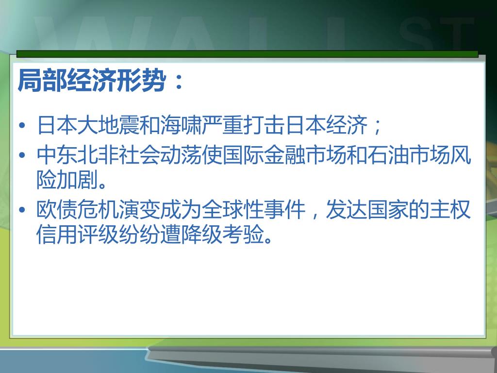 局部经济形势: • 日本大地震和海啸严重打击日本经济; • 中东北非社会动荡使国际金融市场和石油市场风险加剧。 • 欧债危机演变成为全球性事件,发达国家的主权信用评级纷纷遭降级考验。