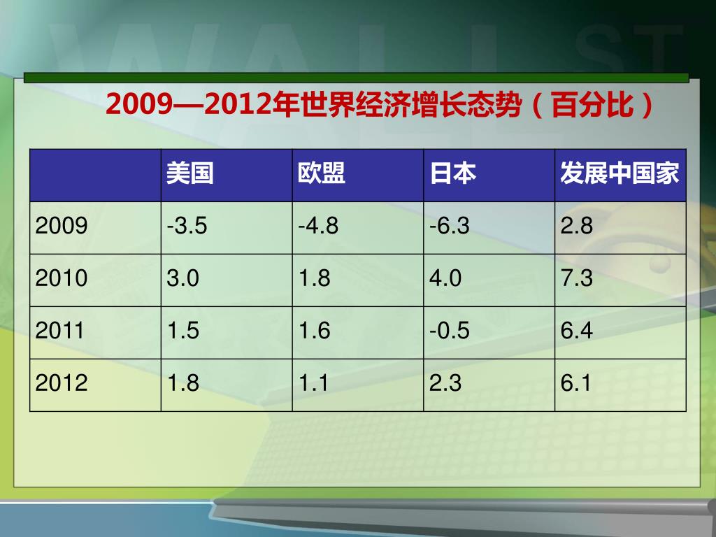 2008年国际金融危机之后,以美国经济2009年第三季度恢复正增长为标志,国际金融危机从2009年底开始进入了一个缓慢而复杂的复苏发展阶段(后危机时期),在这个阶段,国际金融危机的深层次矛盾依然没有解决,其消极影响还在不断扩散:2008年国际金融危机之后,以美国经济2009年第三季度恢复正增长为标志,国际金融危机从2009年底开始进入了一个缓慢而复杂的复苏发展阶段(后危机时期),在这个阶段,国际金融危机的深层次矛盾依然没有解决,其消极影响还在不断扩散: 二、国际金融危机