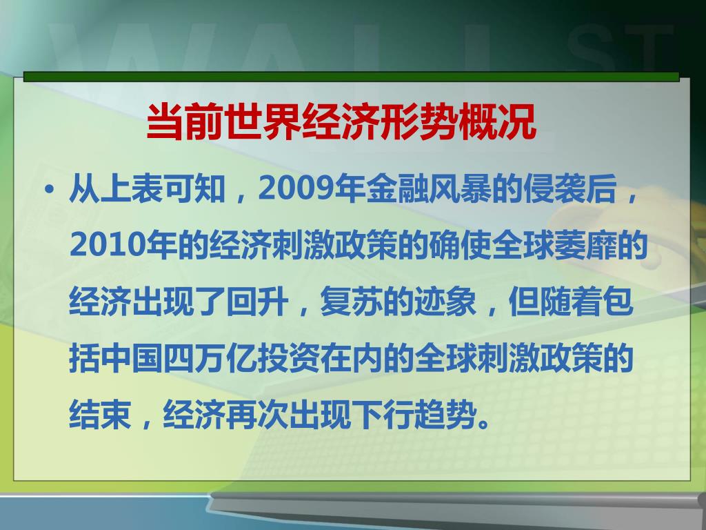 从上表可知,2009年金融风暴的侵袭后,2010年的经济刺激政策的确使全球萎靡的经济出现了回升,复苏的迹象,但随着包括中国四万亿投资在内的全球刺激政策的结束,经济再次出现下行趋势。从上表可知,2009年金融风暴的侵袭后,2010年的经济刺激政策的确使全球萎靡的经济出现了回升,复苏的迹象,但随着包括中国四万亿投资在内的全球刺激政策的结束,经济再次出现下行趋势。 当前世界经济形势概况