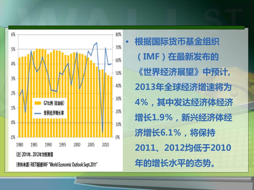 根据国际货币基金组织(IMF)在最新发布的《世界经济展望》中预计, 2013年全球经济增速将为4%,其中发达经济体经济增长1.9%,新兴经济体经济增长6.1%,将保持2011、2012均低于2010年的增长水平的态势。