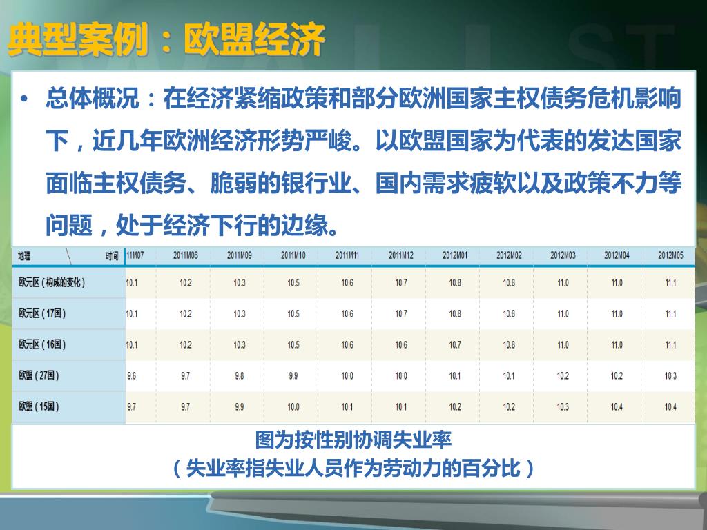 典型案例:欧盟经济 • 总体概况:在经济紧缩政策和部分欧洲国家主权债务危机影响下,近几年欧洲经济形势严峻。以欧盟国家为代表的发达国家面临主权债务、脆弱的银行业、国内需求疲软以及政策不力等问题,处于经济下行的边缘。 图为按性别协调失业率 (失业率指失业人员作为劳动力的百分比)