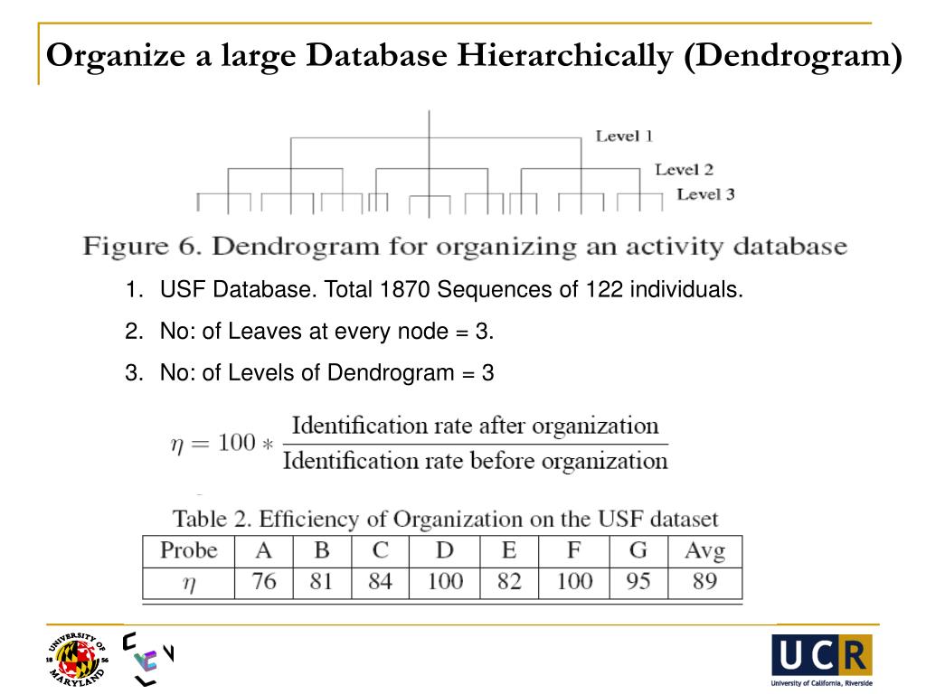 Organize a large Database Hierarchically (Dendrogram) • USF Database. Total 1870 Sequences of 122 individuals. • No: of Leaves at every node = 3. • No: of Levels of Dendrogram = 3