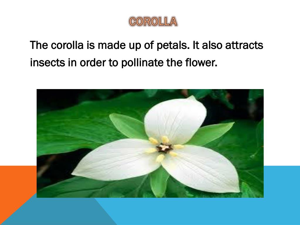 Corolla • Thecorollaismade up of petals. Italsoattracts • insects in ordertopollinatetheflower.