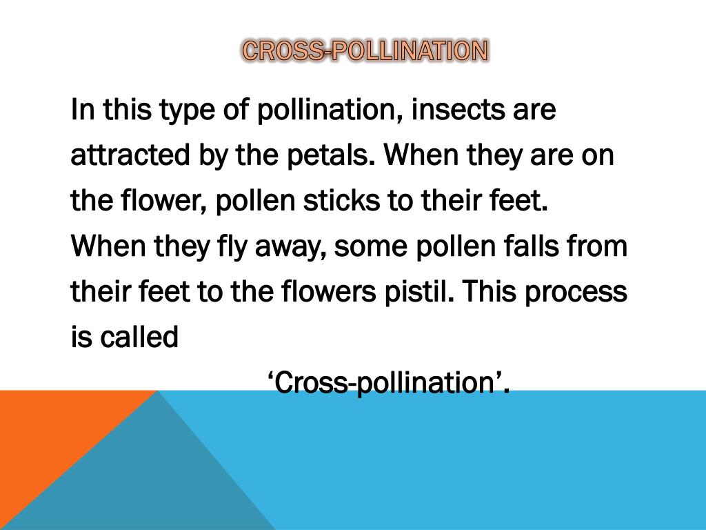 Cross-pollination • In thistype of pollination, insects are • attractedbythepetals. Whenthey are on • theflower, pollenstickstotheirfeet. • Whentheyflyaway, somepollenfallsfrom • theirfeettotheflowerspistil. Thisprocess • iscalled • ‘Cross-pollination’.