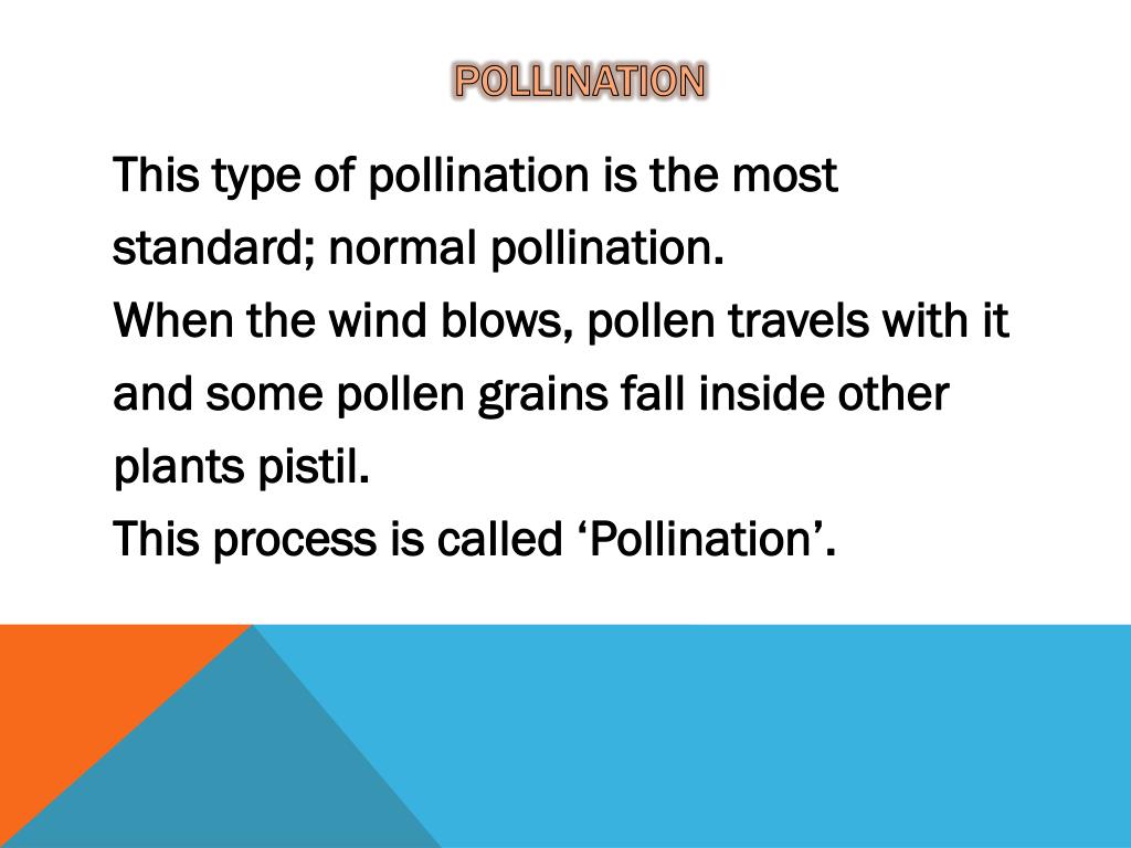 pollination • Thistype of pollinationisthemost • standard; normal pollination. • Whenthewindblows, pollen travels withit • and somepollengrainsfallinsideother • plantspistil. • Thisprocessiscalled ‘Pollination’.